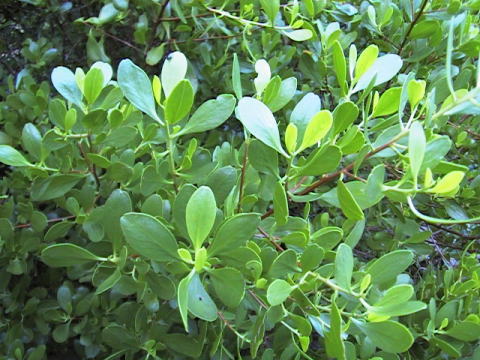 | 沖縄では高さ5メートルほどの低木であるが、熱帯では喬木、花は白色。がくは緑色のがく筒からなり先端の裂片は短い。果実は緑色、長楕円形、長さ約1〜1.5センチメートル。葉は小さく互生し光沢がある。葉枝の先に集まり、ほぼ斜め上から垂直にたち、肉質、卵形で先端近くが広くなり、先は凹む。呼吸根は著しくないが、地上部に露出した側根が長く匍匐し、側根から枝分かれした根を地下に下ろす。 陸化した高まったマングローブ湿地に生育し、沖縄島が北限。 |